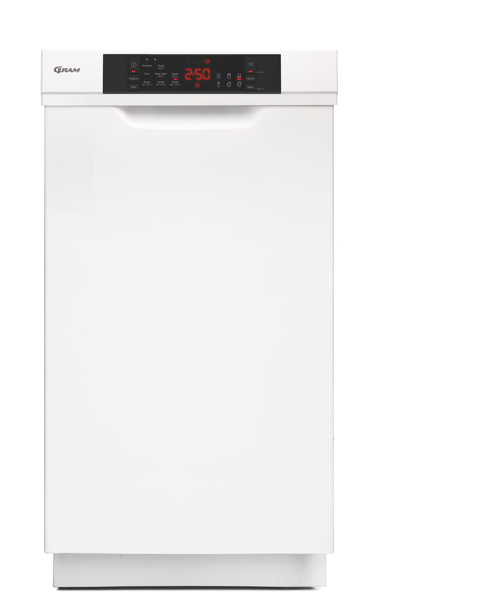 Gramin 45 cm leveä valkoinen astianpesukone LCD-näytöllä.
