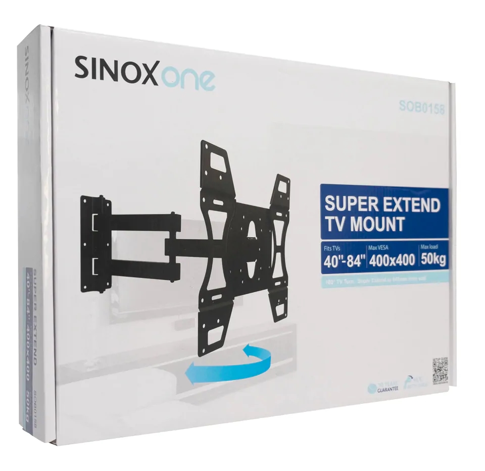Sinox ONE SOB0158 seinäteline. Suositeltu koko 40-85" taulutelevisioille. Kääntyvä 180 astetta, kolmella nivelellä, 630 mm seinästä, max 50 kg, VESA 200x200 - 400x400