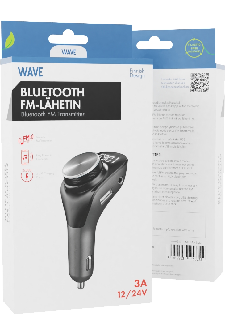 Wave Bluetooth FM-lähetin muuttaa autoradion nykyaikaiseksi viihdekeskukseksi. Voit toistaa musiikkia tai vaikka äänikirjoja auton stereoihin puhelimesta bluetoothilla, muistikortilta tai USB-tikulta.
