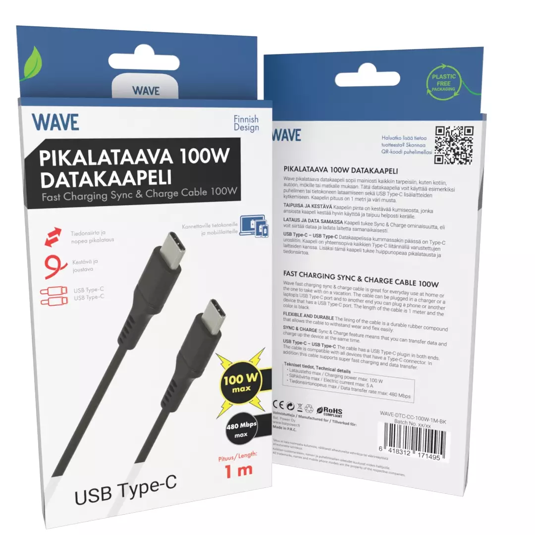 Wave Pikalataava 100W datakaapeli USB-C -> USB-C -liitännöillä. Kaapelin pituus 1 metri ja väri musta. Latausteho 100 W max. Tiedonsiirtonopeus 480 Mbps max. Yhteensopiva USB Type-C -liitintä käyttävien laitteiden kanssa.