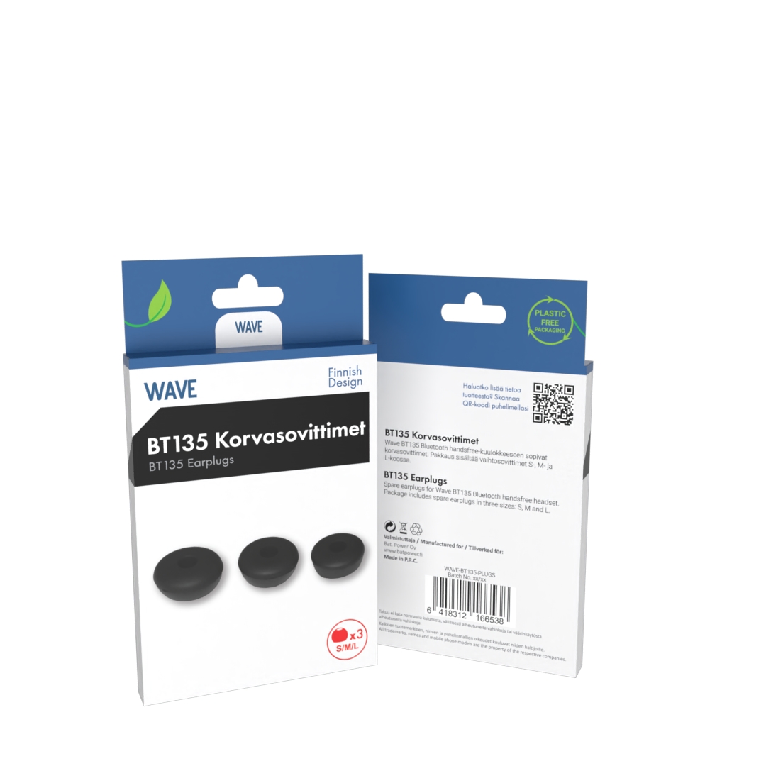 Wave BT135 Bluetooth handsfree-kuulokkeen varaosapakkaus. Pakkaus sisältää 3 kpl eri kokoisia korvasovittimia (S/M/L). Yhteensopiva laitteelle WAVE-BT135S ja Jabra Talk 65.