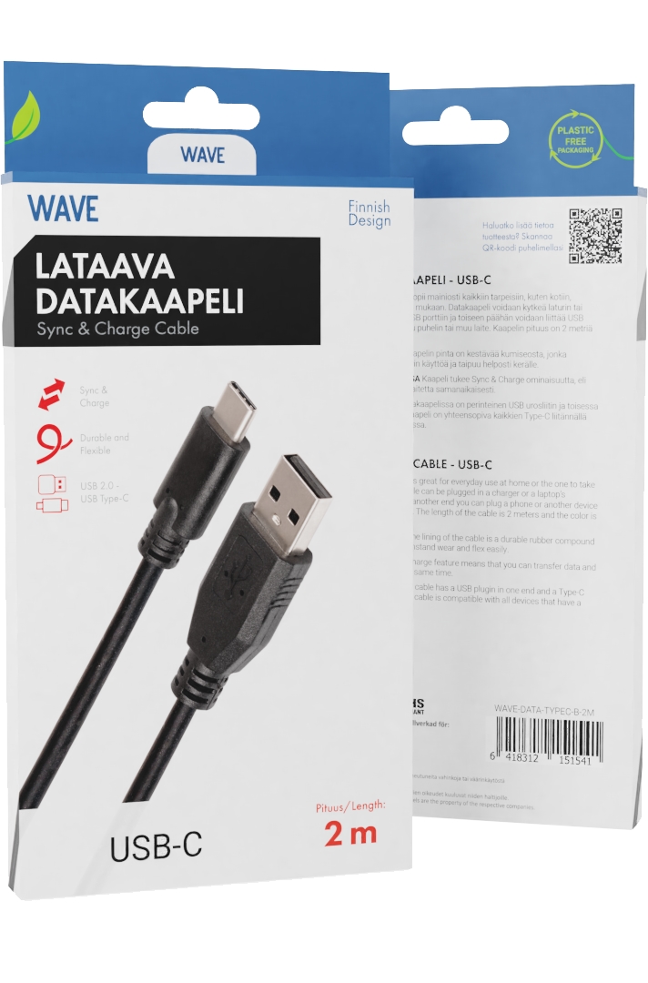 Wave lataava datakaapeli USB 2.0 (480 Mbit/s) -> Type-C liitännöillä. Kaapelin pituus 2 metriä ja väri musta. Yhteensopiva Type-C -liitintä käyttävien laitteiden kanssa.