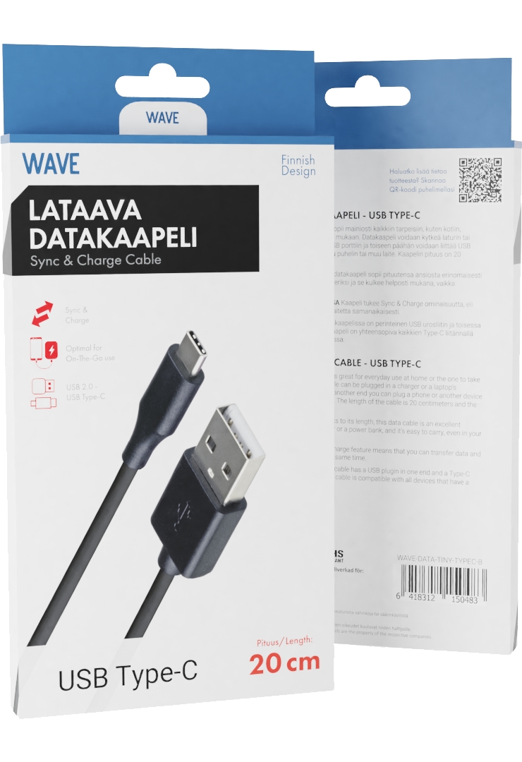 Wave lataava datakaapeli USB 2.0 (480Mbit/s) -> Type-C liitännöillä. Kaapelin pituus 20 cm ja väri musta. Yhteensopiva Type-C -liitintä käyttävien laitteiden kanssa.