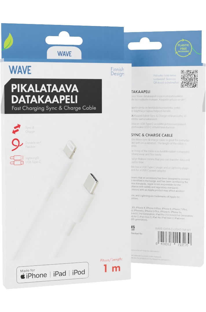 Wave pikalataava datakaapeli Apple Lightning® liittimellä sopii mainiosti kaikkiin tarpeisiin, kuten kotiin, mökille tai matkalle mukaan. Kaapelin pituus on yksi metri ja väri valkoinen.