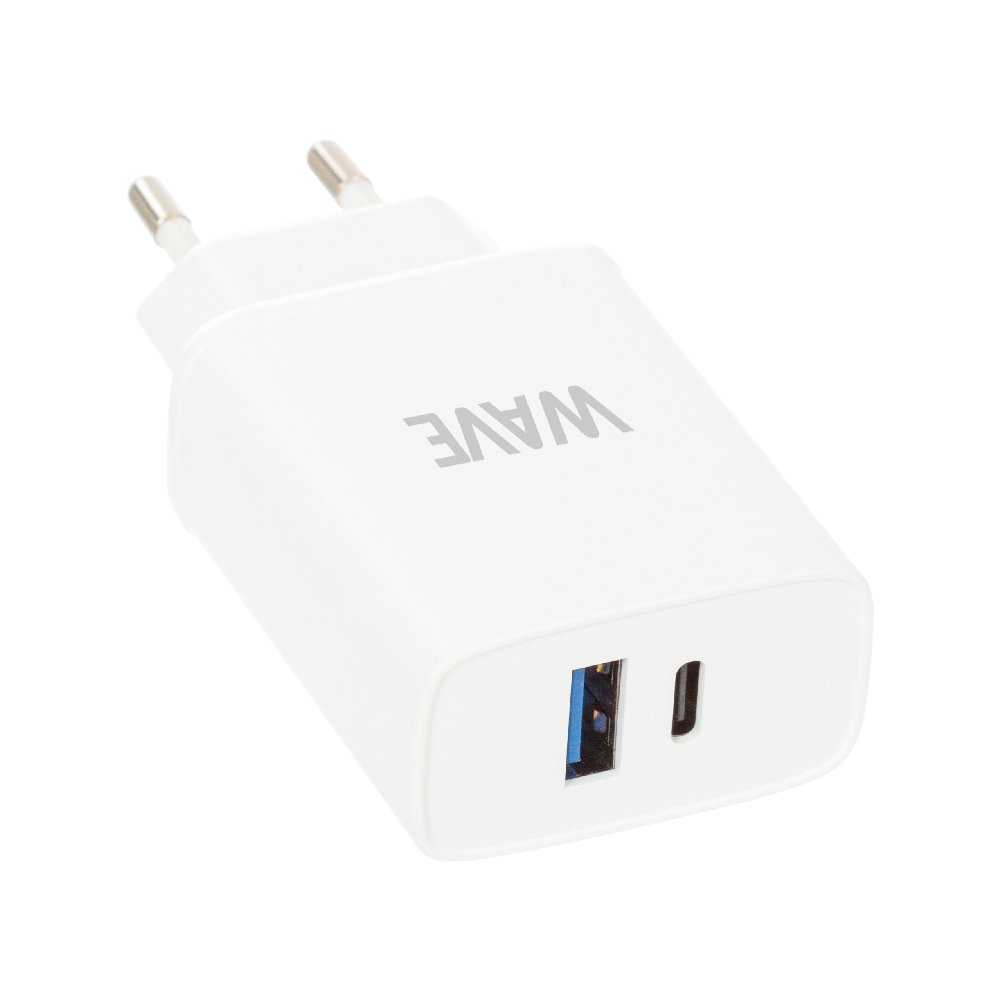 Wave Pikalataava Verkkolaturi yhdellä USB-C liitännällä ja yhdellä USB-A liitännällä. Kokonaisteho 18 W. Väri valkoinen.