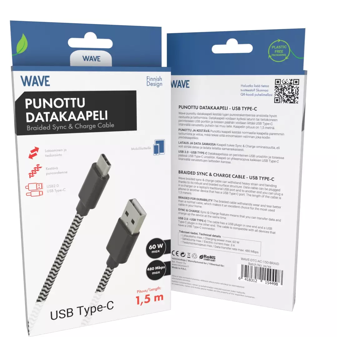 Wave Punottu lataava datakaapeli USB-A 2.0 -> USB-C -liitännöillä. Kaapelin pituus 1,5 metriä ja väri mustavalkoinen. Latausteho 60 W max. Tiedonsiirtonopeus 480 Mbps max. Yhteensopiva USB Type-C -liitintä käyttävien laitteiden kanssa.