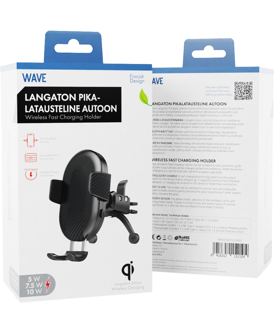 Wave Qi autoteline langattomalla pikalatauksella (5W, 7.5W & 10W). Maksimiteho lataukselle 10W. Ladattavan laitteen mukaan itsestään säätyvä latausteho. Kiinnittyy tukevasti auton ilmastointiritilään. Väri: musta.