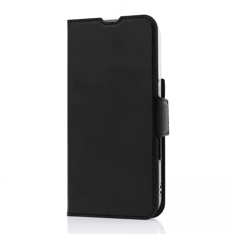 Wave Book Case musta suojakotelo Apple iPhone 16 -puhelimelle. MagSafe-yhteensopiva. Magneettisulkuinen kansi, korttipaikat RFID-suojauksella ja läpinäkyvä muovikelkka (PC). Pintamateriaali laadukasta nahkaa, jossa antimikrobipinnoite.