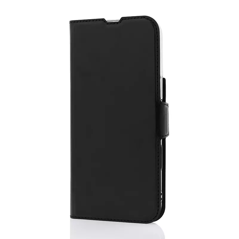 Wave Book Case musta suojakotelo Apple iPhone 16 Pro Max -puhelimelle. MagSafe-yhteensopiva. Magneettisulkuinen kansi, korttipaikat RFID-suojauksella ja läpinäkyvä muovikelkka (PC). Pintamateriaali laadukasta nahkaa, jossa antimikrobipinnoite.