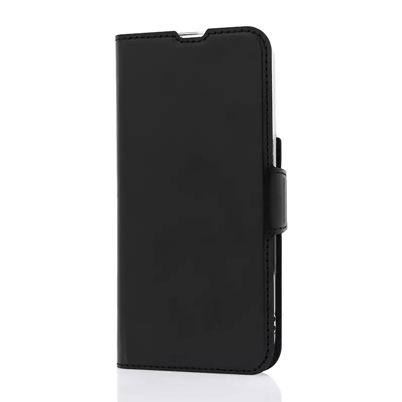 Wave Book Case musta suojakotelo Apple iPhone 16 Pro -puhelimelle. MagSafe-yhteensopiva. Magneettisulkuinen kansi, korttipaikat RFID-suojauksella ja läpinäkyvä muovikelkka (PC). Pintamateriaali laadukasta nahkaa, jossa antimikrobipinnoite.