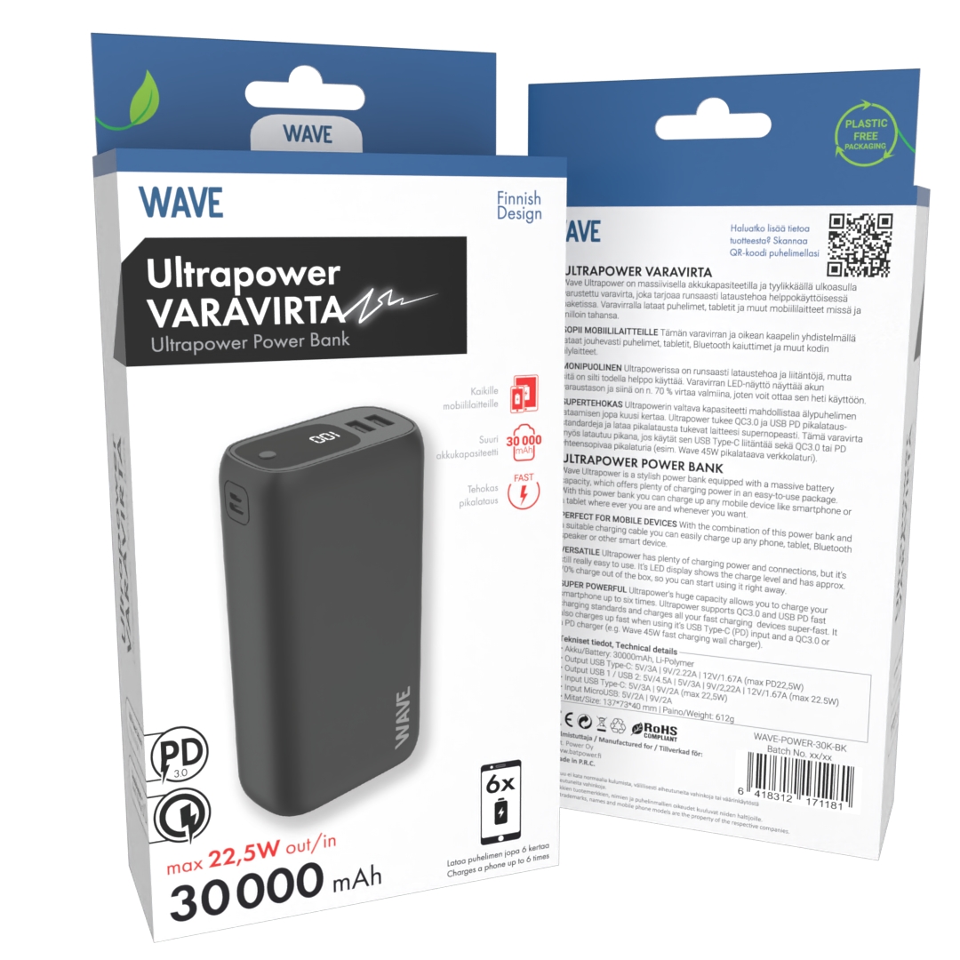 Wave Ultrapower lisävirtalähde 30000 mAh akkukapasiteetilla. Latausvirta USB-paikoista 5V/4,5A | 5V/3A | 9V/2A | 12V/1,5A. Lataus MicroUSB tai USB-C liitännöistä (5V/3A, 5V/2A tai 9V/2A). USB-C -kaapeli pakkauksessa. Akku: Li-Polymer. Väri: musta.