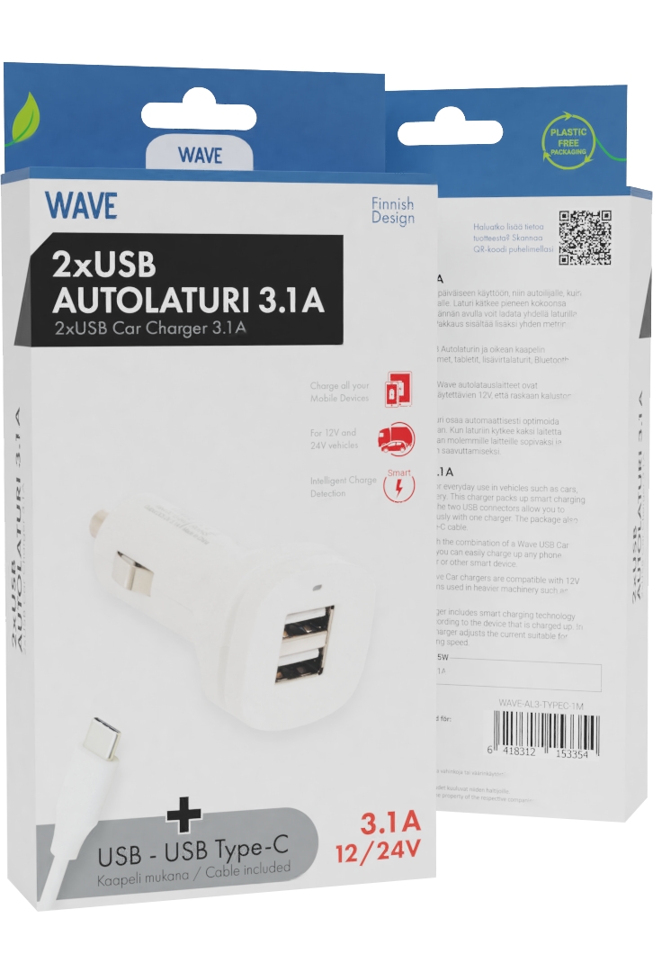 - Myyntipakkauksen sisältö: Wave autolaturi, USB Type-C -kaapeli (1m)