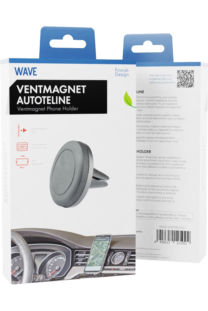 Wave Ventmagnet on auton ilmastointiritilään kiinnitettävä magneettiteline. Pakkauksessa kaksi vastakappaletta, toinen liimalla (tarralla) kiinnitettäväksi ja toinen puhelimen ja suojakuoren väliin asetettava.