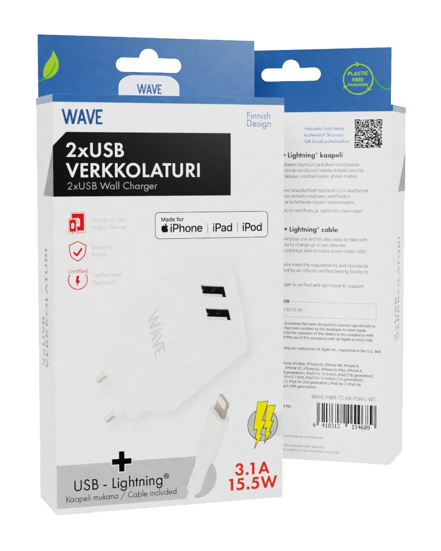 Wave verkkolaturi kahdella USB-liitännällä ja Apple Lightning MFI -kaapelilla (1 m). Kokonaisteho 15,5 W ja latausvirta maksimissaan 3,1 A. Apple-laitteille optimoidut USB-liitännät 2,1 A / 5 V ja 1 A / 5 V tehoilla. Väri valkoinen.