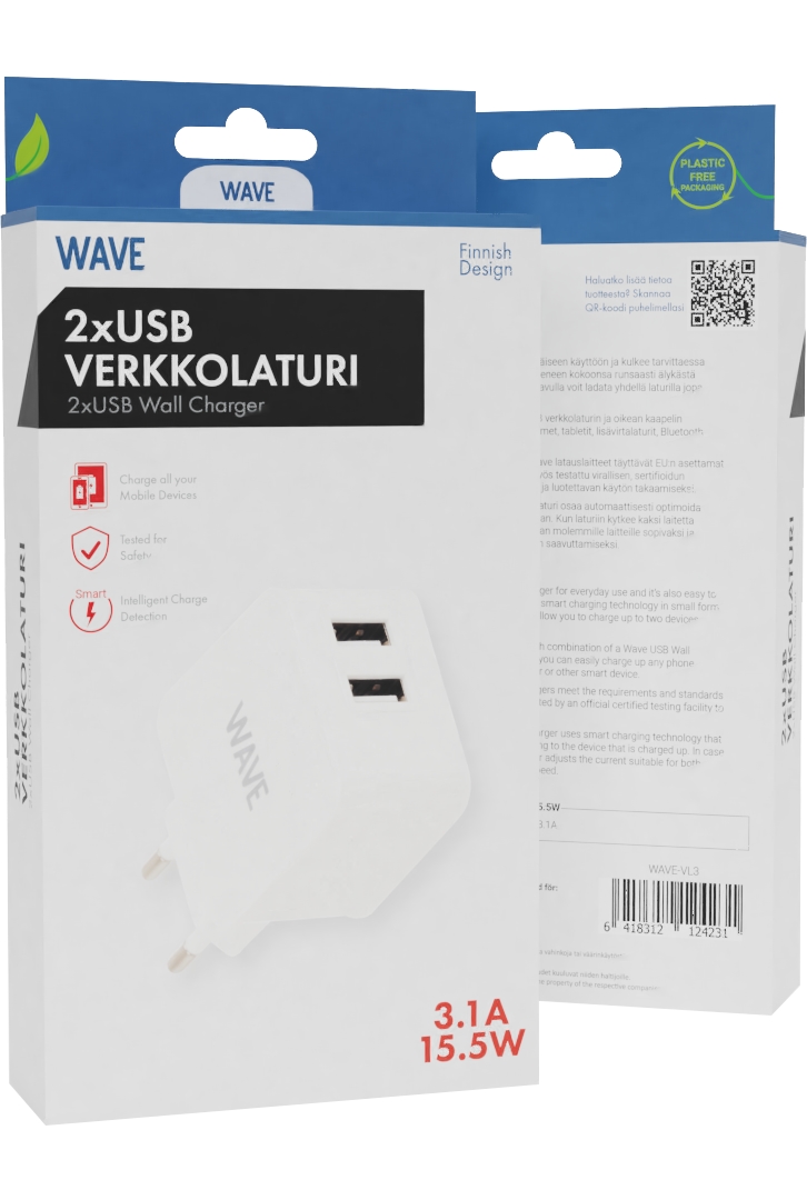 Wave Verkkolaturi kahdella USB liitännällä. Kokonaisteho 15,5W ja latausvirta maksimissaan 3,1A. Kahta laitetta ladattaessa latausvirta optimoidaan laitteiden välillä sopivaksi. Väri valkoinen.
