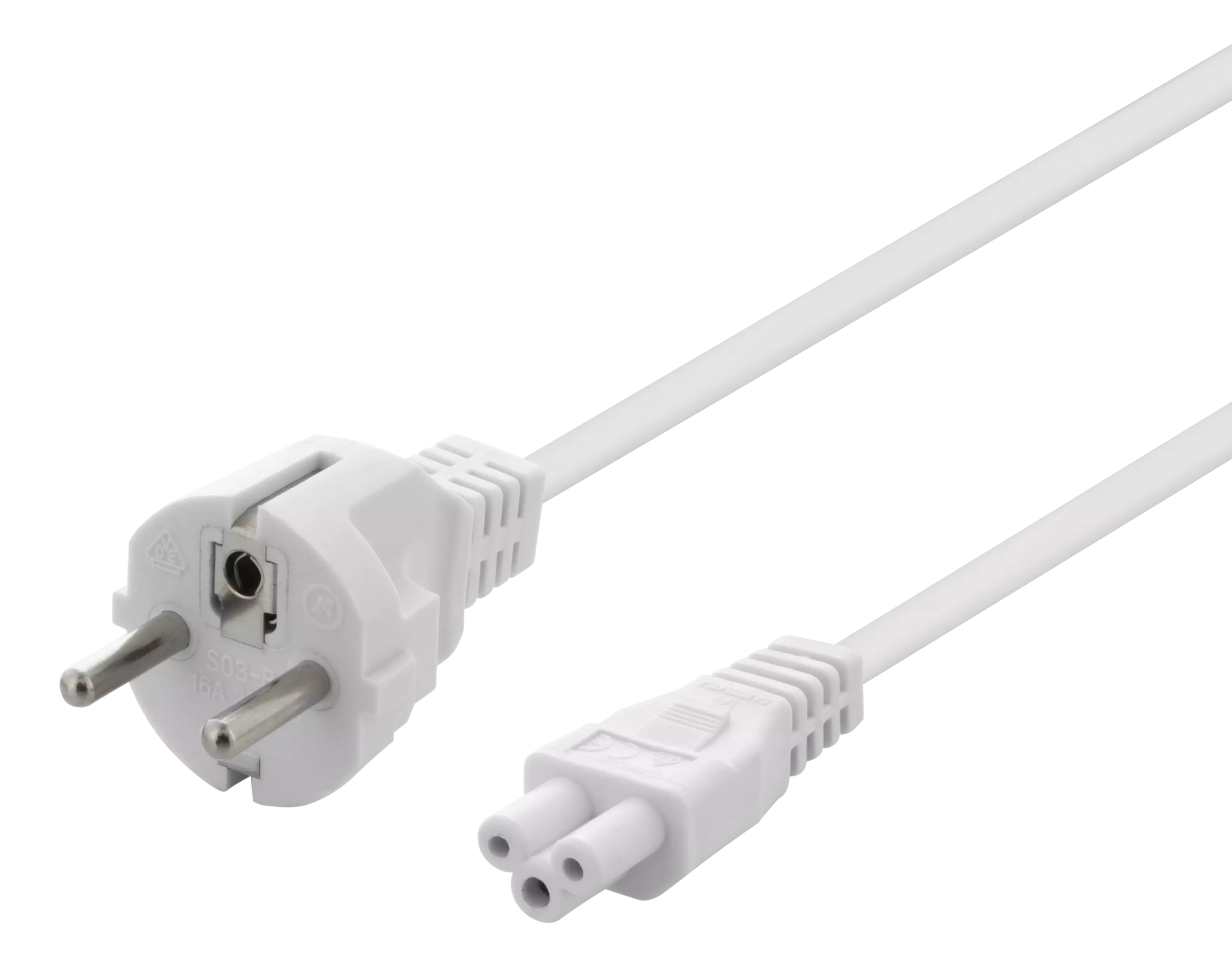 Deltacon maadoitettu laitekaapeli, kytketään laitteen ja pistorasian välille, suora CEE 7/7 - suora IEC 60320 C5, korkeintaan 250 V / 2,5 A, 2 m, 3 x 0,75 mm2, valkoinen. Kaapeli, jolla voi esim. kytkeä tietokoneen virtasovittimen pistorasiaan.