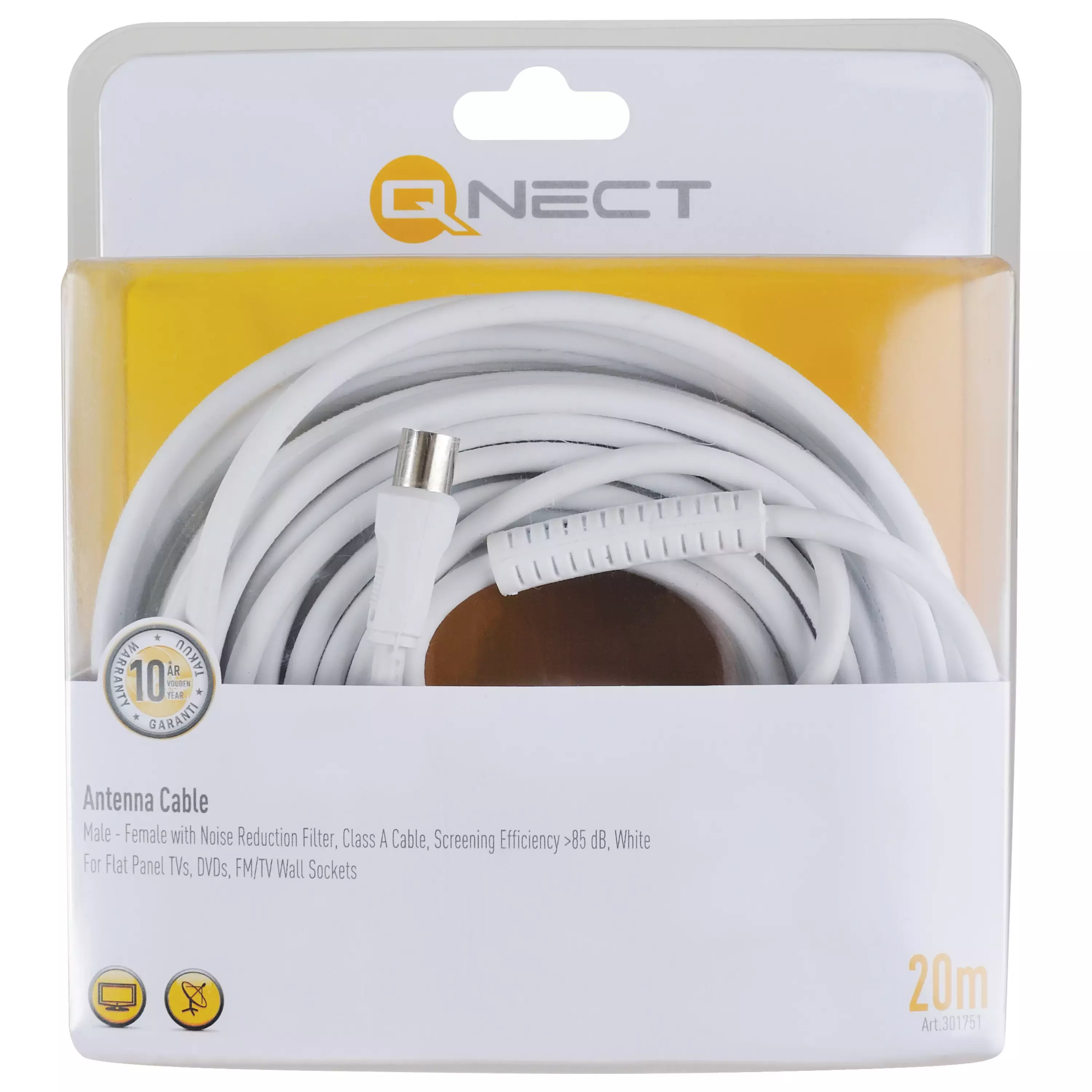 Qnectin 20 metrin antennikaapeli, uros - naaras ferriittisuotimella, Class A -kaapeli, suojausvaimennus >85 dB, valkoinen. Televisioille, digibokseille, FM/TV-seinäpistokkeille.