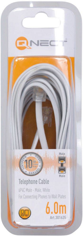 Qnectin 6 metrin puhelinkaapeli. 6P4C uros - 6P4C uros. Puhelinlaitteiden tai modeemin liittämiseen seinäpistokkeeseen.