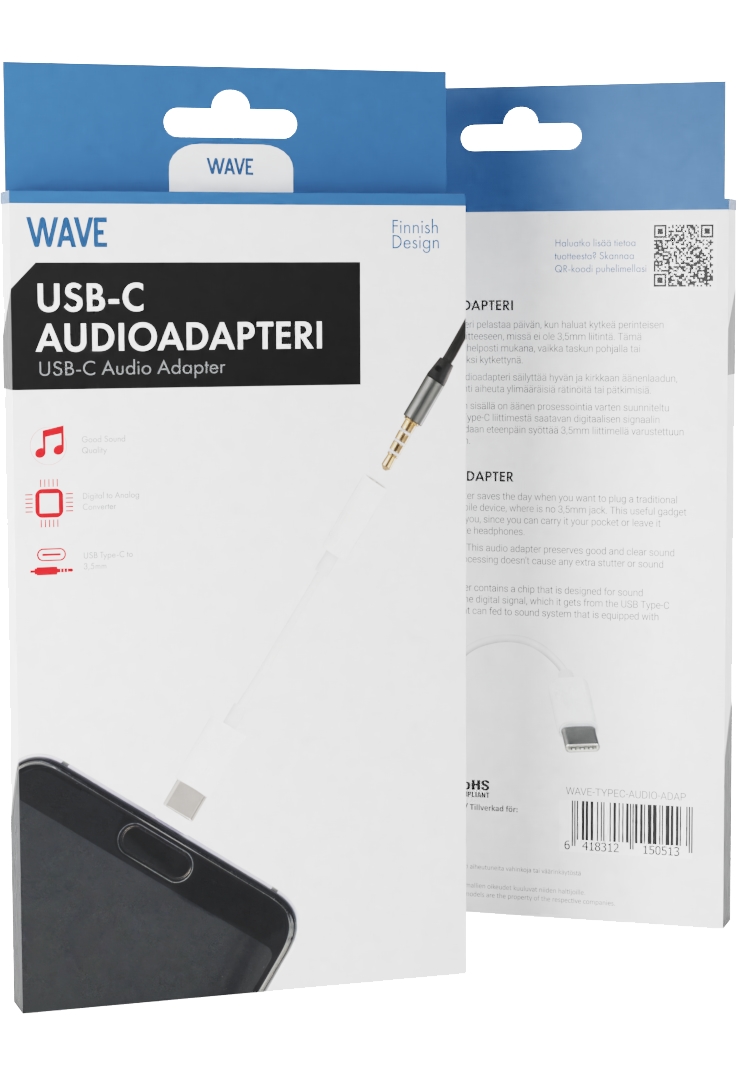 Wave USB-C audioadapteri pelastaa päivän, kun haluat kytkeä perinteisen kuulokeliittimen mobiililaitteeseen, missä ei ole 3.5 mm liitintä. Tämä hyödyllinen johdonpätkä kulkee helposti mukana, vaikka taskun pohjalla tai lempikuulokkeisiin valmiiksi kytkettynä.