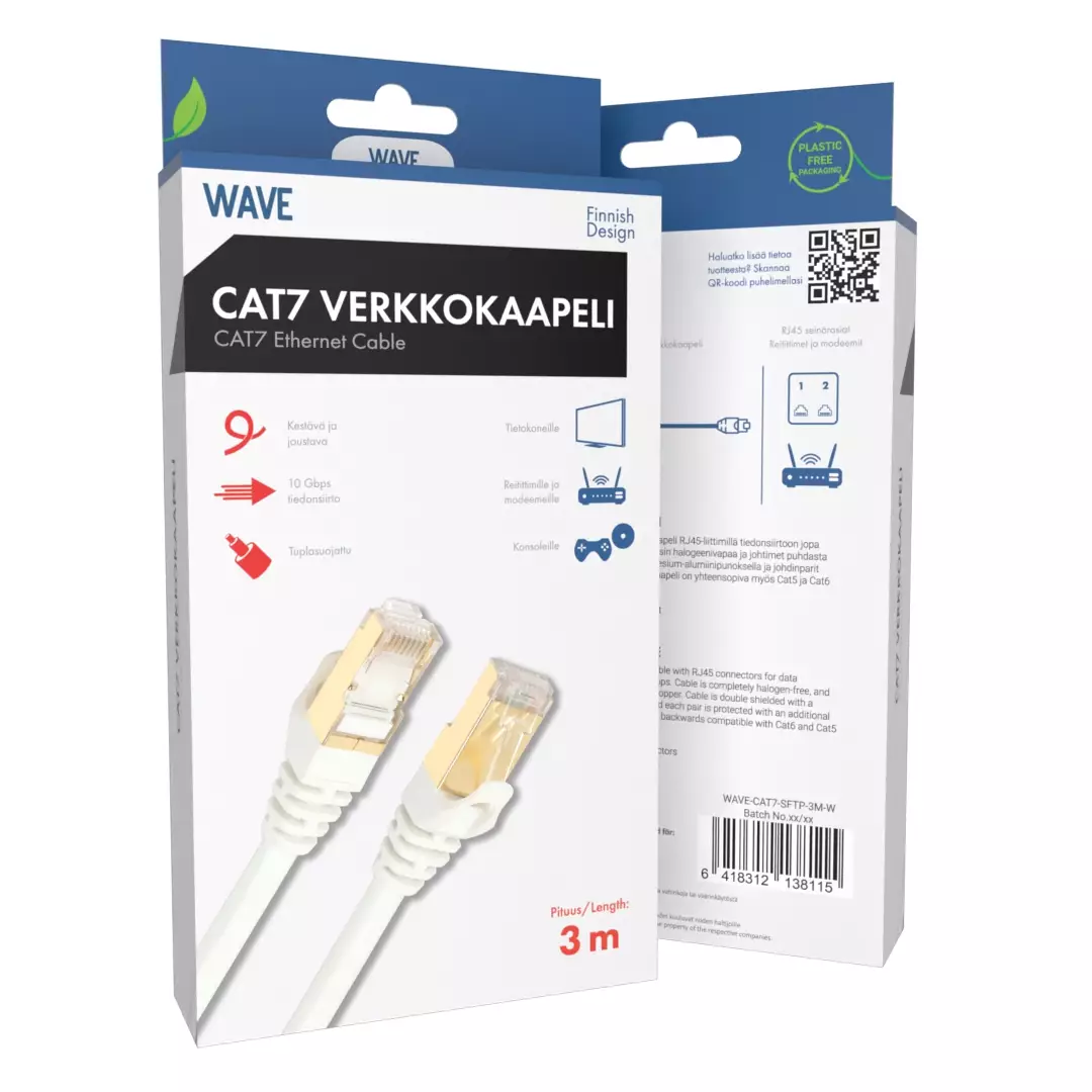 Huippunopea Wave Cat7 verkkokaapeli RJ45-liittimillä tiedonsiirtoon jopa 10 Gbps:n nopeudella. Kaapeli on täysin halogeenivapaa ja johtimet puhdasta kuparia. Kaapeli on suojattu magnesium-alumiinipunoksella ja johdinparit erillisillä foliosuojilla. Tämä Cat7-kaapeli on yhteensopiva myös Cat5- ja Cat6-standardien kanssa. Kaapelin pituus on 3 metriä ja väri valkoinen.