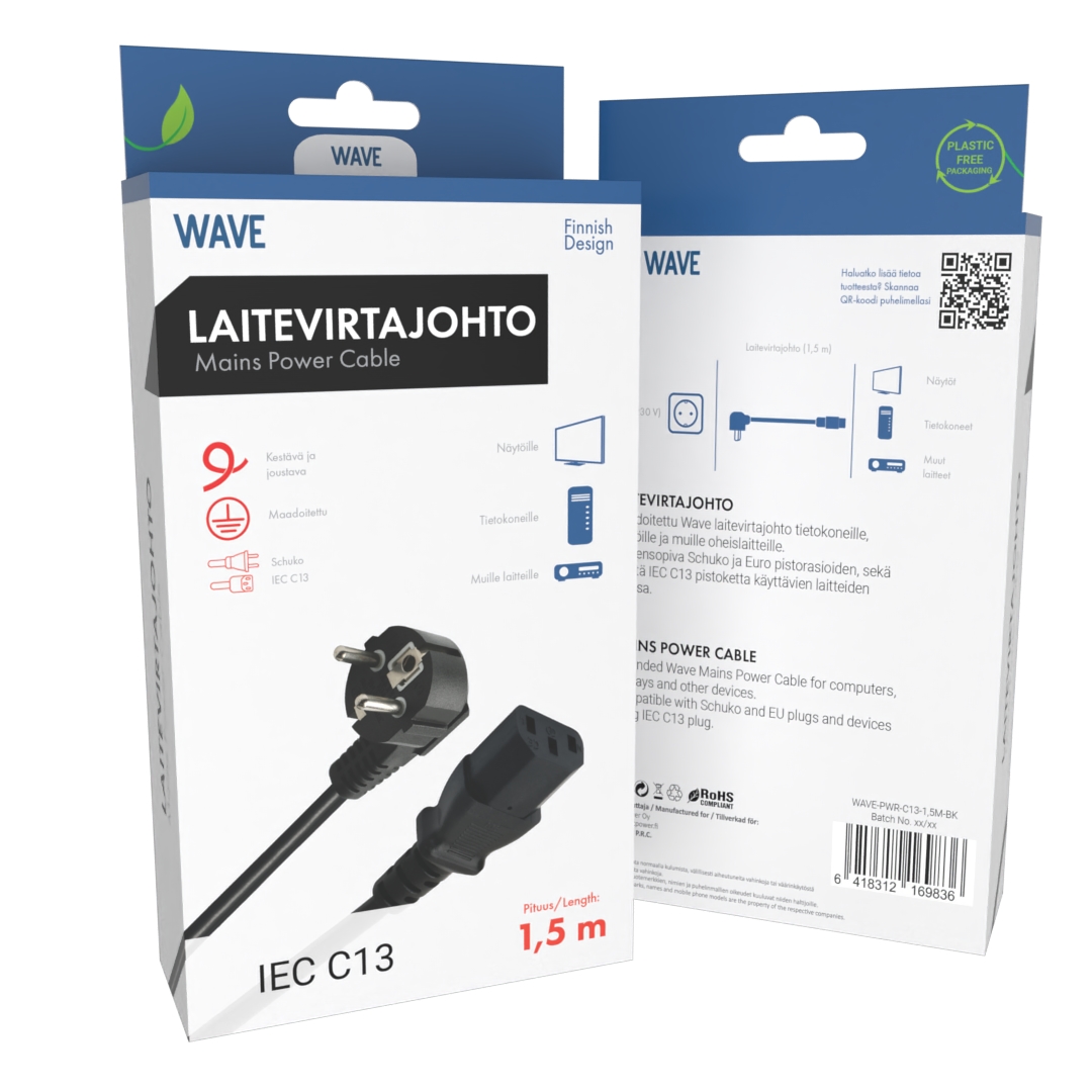 Maadoitettu Wave-laitevirtajohto tietokoneille, näytöille ja muille oheislaitteille. Yhteensopiva Schuko- ja Euro-pistorasioiden sekä yleistä IEC C13 -pistoketta käyttävien laitteiden kanssa.