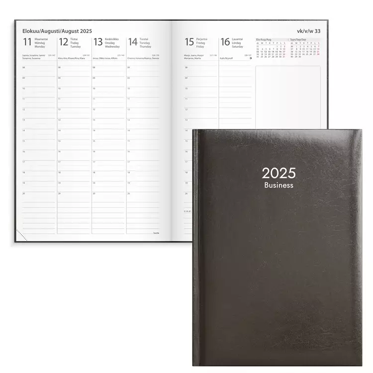 A5-kokoinen Burde Business 2025 musta vuosikalenteri keinonahkakannella, sidottu. Kalenterin aukeamalla yksi viikko, tuntijaotus 08-20, palsta muistiinpanoille, kuluvan ja seuraavan kuukauden... Lue lisää