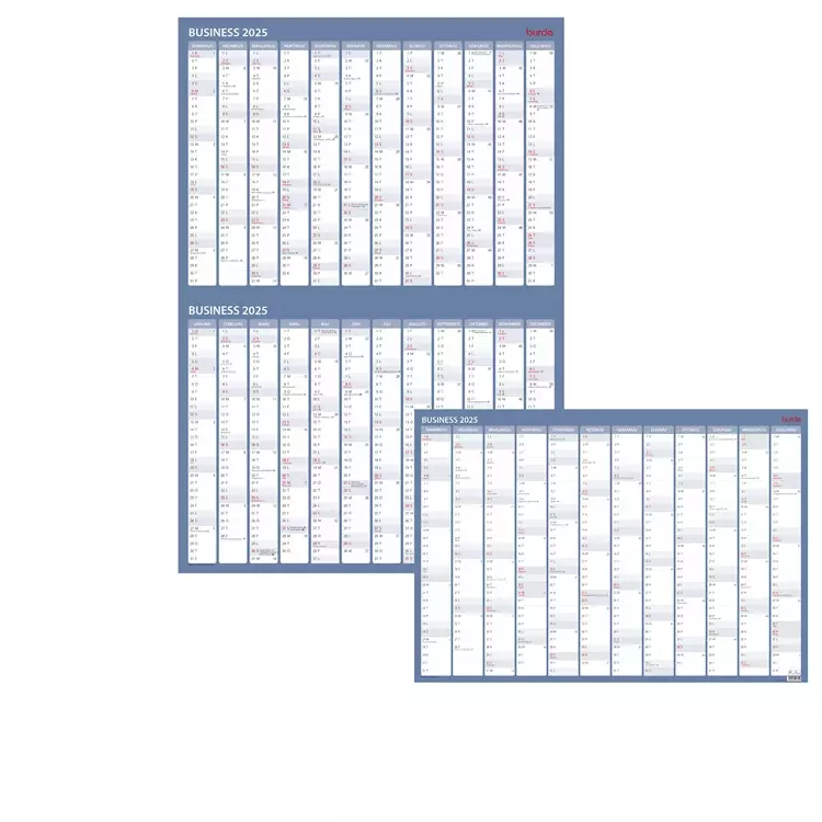 Burde Business 2025 seinälehti vuosikalenteri. Iso ja selkeä suunnitelmakalenteri. Muistiinpanotilaa jokaiselle päivälle. Kalenteri sisältää liputuspäivät, valitut kirkkopyhät ja juhlapyhät. Kääntöpuolella sekä suomenkieliset että ruotsinkieliset pienennetyt kalenterit. FSC. Koko: 850 x 590 mm.