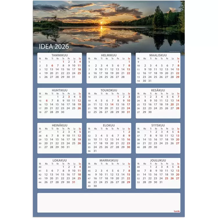 Burde Seinälehti Idea 2026 -kalenteri. Burden Seinälehti Idea on suurikokoinen ja selkeä vuositaulukko vuodelle 2026. Kääntöpuolella on suomen- ja ruotsinkieliset pienennetyt kalenterit. Tuote on valmistettu FSC-sertifioidusta materiaalista. Mitat: 520 x 740 mm.