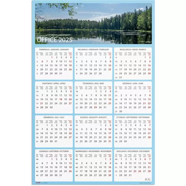Burde Office 2025 seinälehti vuosikalenteri. Seinällä pidettävä selkeä vuositaulukko. Kolmikielinen: suomi / ruotsi / englanti. FSC. Koko: 400 x 600 mm.