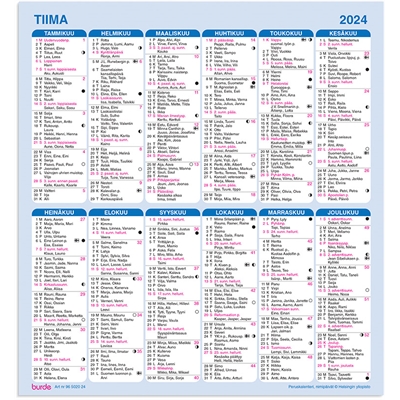 Burde Seinälehti Tiima 2024. Ripustinreikä kalenterin yläreunassa. Kaksipuolinen. Kalenteri sisältää nimipäivät, kansalliset pyhäpäivät, liputuspäivät ja kuun vaiheet. Kaksikielinen:... Lue lisää