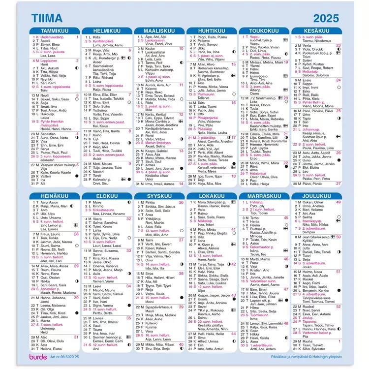Burde Tiima 2025 seinälehti vuosikalenteri. Ripustinreikä kalenterin yläreunassa. Kaksipuolinen. Kartonkinen kalenteri sisältää nimipäivät, kansalliset pyhäpäivät, liputuspäivät ja kuun... Lue lisää