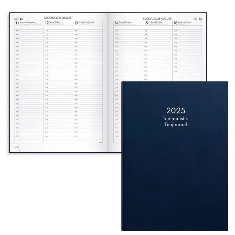 Burde Tuntimuistio 2025 sininen sidottu keinonahkakannellinen vuosikalenteri. Tukevat siniset keinonahkakannet. Kalenterin aukeamalla yksi viikko, tuntijaotus 08-21 (arkipäivinä) puolen tunnin... Lue lisää