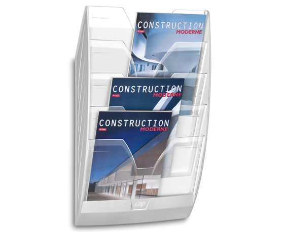 Seinäteline, 5-osainen. Toimitukseen sisältyy tarvittavat kiinnitysosat. Kierrätyskelpoista polystyreenimuovia. Lokeroon sopii 24 x 32 cm asiakirjat. Ulkomitat 350 x 120 mm. Korkeus 580 mm. Väri kirkas/valkoinen. Yhteensopiva muotoilu ja väri CEP- laatikostojen kanssa.
