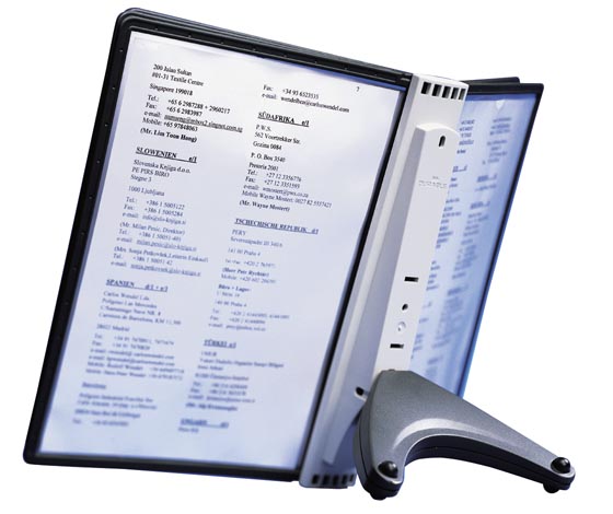 Durablen Sherpa Soho on pöydällä seisova pikahakuteline, joka sisältää 5 mustareunaista, A4-kokoista taskua. Taskujen materiaali mattapintainen, heijastamaton polypropeeni. Paino 1,2 kg. Takuu 5 vuotta.
