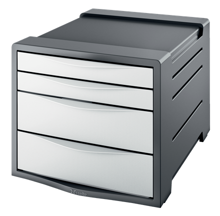 Esselte Vivida 4-osainen vetolaatikosto. Kaksi korkeaa laatikkoa työpöydän tarvikkeille ja kaksi matalaa laatikkoa asiakirjoille, kynille ja pientavaroille. Sujuvasti liukuvat laatikot, stopparit estävät laatikon tippumisen. Muotoiltu, kapea kahva helpottaa laatikoiden käsittelyä. Pohjassa olevat kumit pitävät laatikoston paikoillaan.