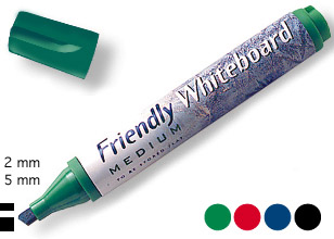 Friendly valkotaulukynä, 4 väriä. Jälki 2-5mm litteällä/viistolla kärjellä. Kirjoituspituus 650 m. Vesiliukoinen. Runko kartonkia. Kierrätysmateriaalien osuus 76 %.