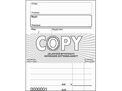Jäljentävää paperia. Perforoitu. Laskelma. Numeroitu. 1+1 kopiota. 100 lehteä. Viivaus, suomi/ruotsi. Yhteenveto takakannessa. Kansi toimii välipahvina. - Tuotteen kierrätys: Toimistopaperi... Lue lisää