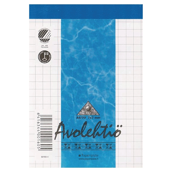 Paperipisteen valmistama A6-kokoinen avolehtiö. 70 lehteä. Ruudutus 7 x 7 mm, perforoitu. Valkoinen puuvapaa paperi 60 g. Joutsenmerkki ja Avainlippu. Nidottu lyhyeltä sivulta. Yläreunassa perforointi helpottamassa lehden irtirepäisyä. Valmistettu Suomessa.