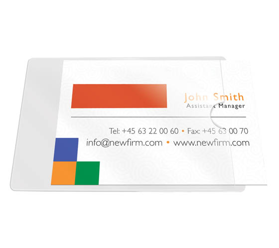 Itseliimautuva etikettitasku, jonka sisään käyntikortti pujotetaan. Myös luottokorteille. Kiinnittyy useimpiin pintoihin. Materiaali PP. 10 kpl/pss.