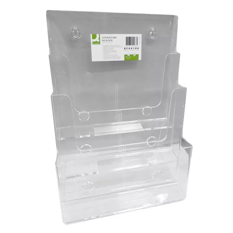 Q-Connectin 3-osainen esiteteline A4-arkeille. Pöydällä pidettävä 3-lokeroinen esiteteline A4-kokoisille esitteille. Yhteen lokeroon mahtuu n. 3 cm nippu esitteitä. Koko L230 x S120 x K310 mm. Materiaali: polystyreeni.