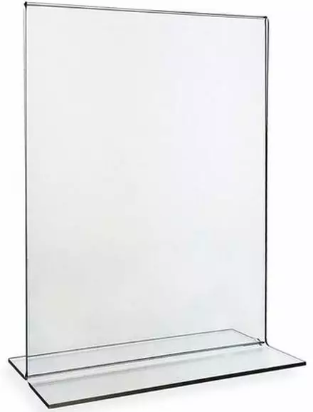 Q-Connectin pystysuuntainen T-mallinen A4-esiteteline. - Kaksipuoleinen - Kirkas / läpinäkyvä - 1-2 A4-esitteelle - Mitat 211 x 93 x 301 mm