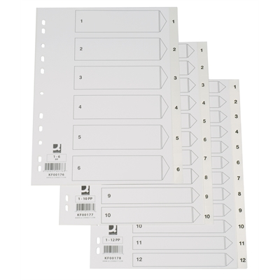Q-Connect hakemisto / välilehdet A4 1-12 PP muovi, valkoinen. Q-Connect muovihakemistossa on valkoiset polypropeeniset lehdet (paksuus 125 my). Painettu etusivu ja kielekkeet. Numerot 1-12.