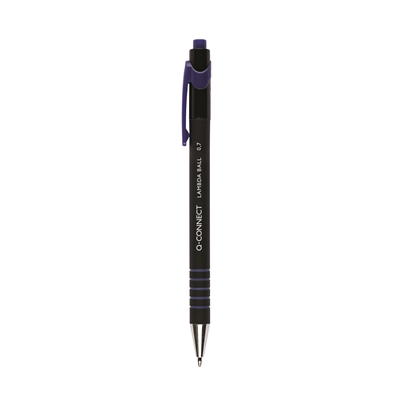 Q-Connect Lamda M sininen kuulakärkikynä. Sininen kumipintainen runko. Muoviklipsi ja metallikärki, kuulakärjen leveys 1,0 mm. Sininen muste.