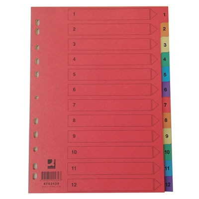 Q-Connect numerohakemisto / välilehdet, A4 1-12 kartonki värillinen. Q-Connect hakemistossa on värilliset kartonkiset (175 g) lehdet ja etusivu. Painettu etusivu ja kielekkeet. Numerot 1-12.