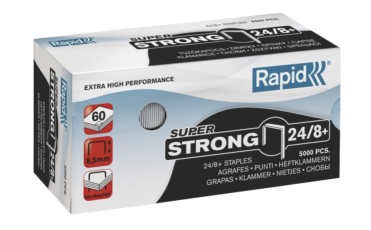 Rapidin 24/8+ Super Strong -nitomanasta Supreme ja Classic -mallistolle. 5000 kpl/rasia. Erittäin vahva lankainen niitti 50 arkin (80 gsm) nidontaan.