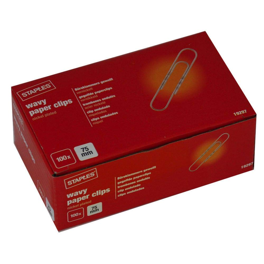 Staples aallotettu paperiliitin 75 mm 100 kappaleen rasiassa.