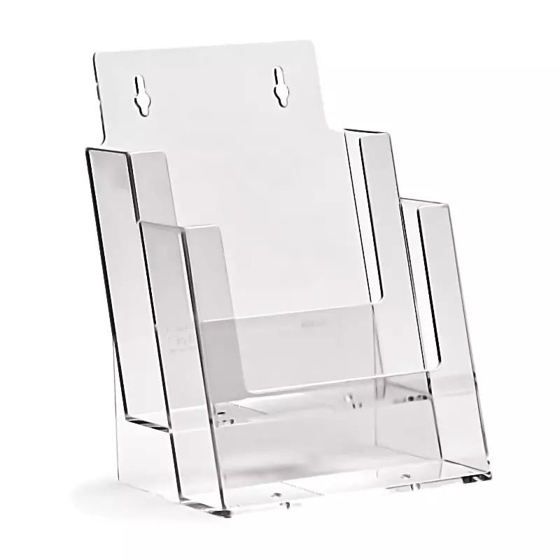 Taymar 2-osainen A5-kokoinen esiteteline. Pöydällä pidettävä. Kirkasta polystyreeniä.