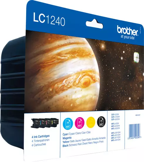 Alkuperäinen Brotherin LC1240 neliväripakkaus, joka sisältää mustan, syaanin, magentan ja keltaisen väripatruunan. Riittoisuus jopa 600 sivua/kasetti.