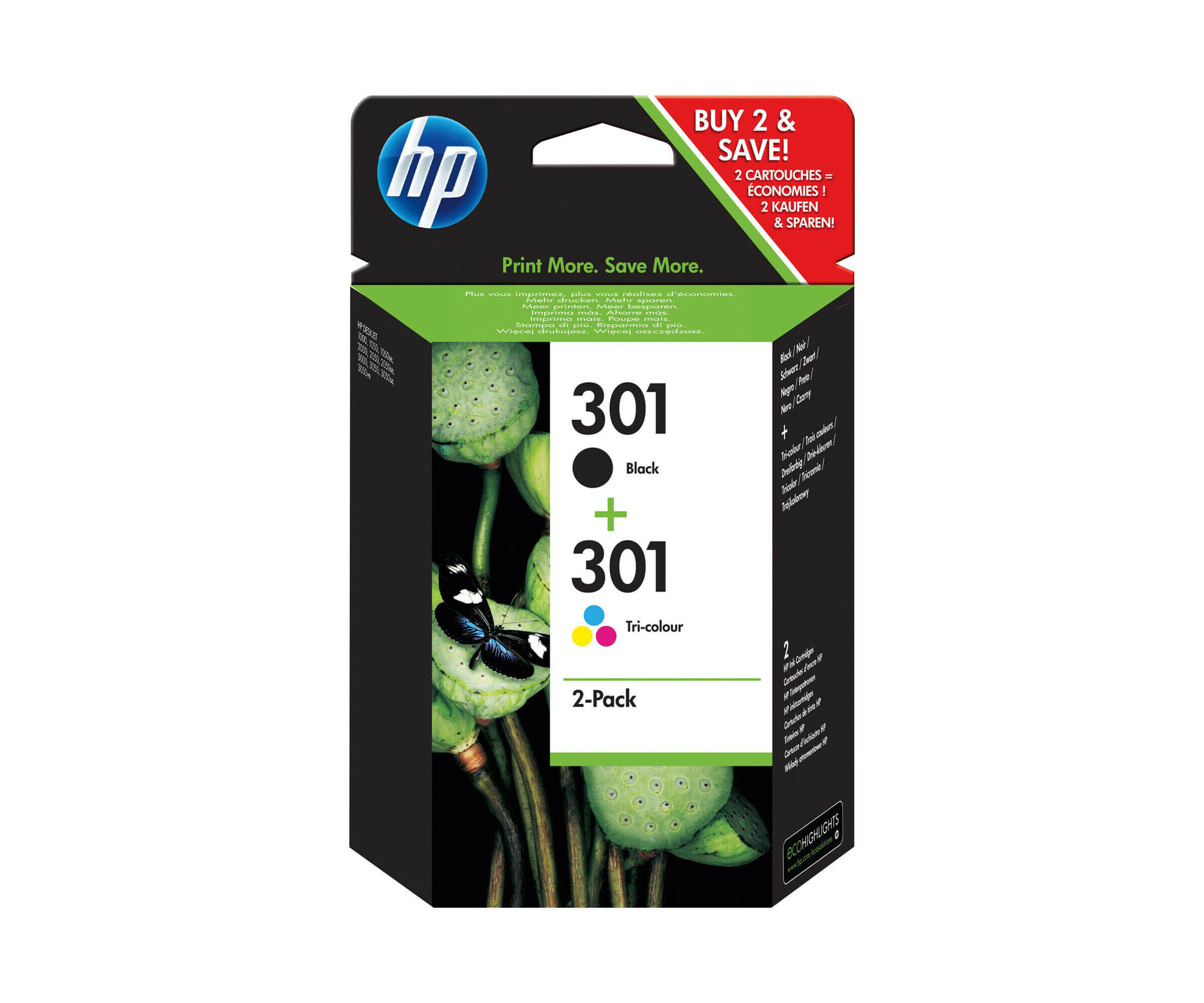 HP 301 -mustekasettipakkaus sisältää mustan ja kolmivärimustekasetin. Muste riittää noin 190/165 sivun tulostukseen (musta/värillinen).